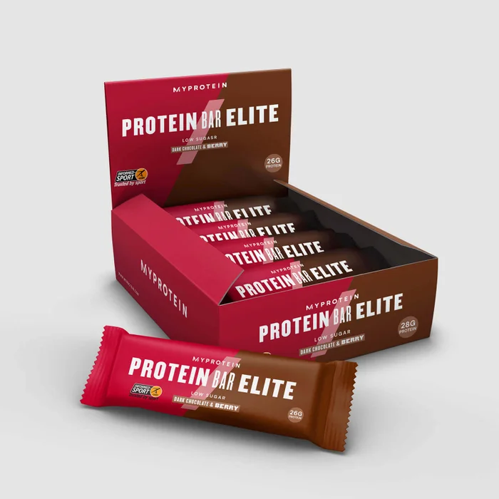 Protein Bar Elite -Zartbitterschokolade BeereUnsere High-Protein Bar enthalten wenig Zucker und 26 g Eiweiß pro Portion. Sie sind ideal für den süßen Heißhunger, ohne dabei deine sportlichen Anstrengungen zunichte zu machen.