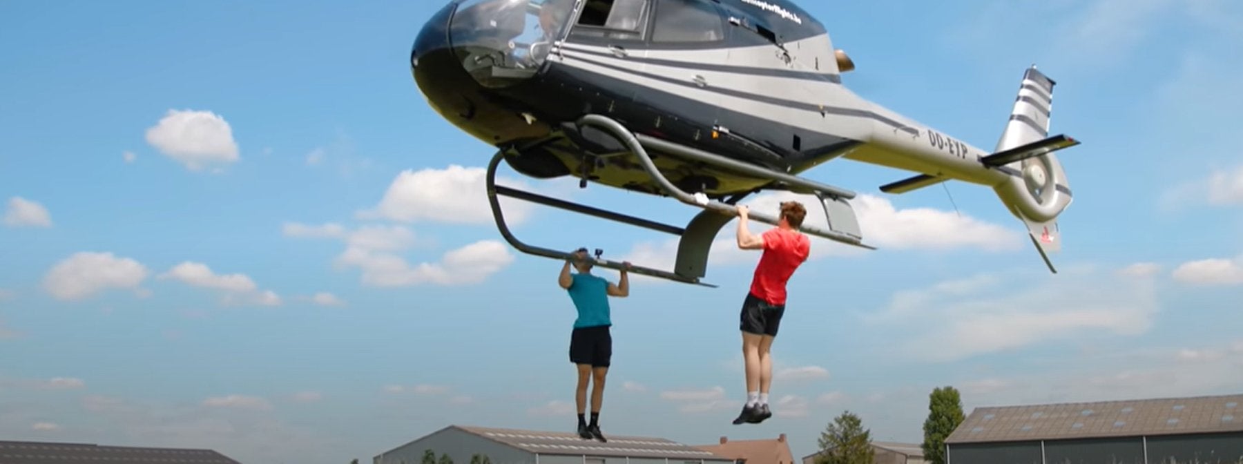 Helikopterlande-Kufen sind dicker und schwieriger zu greifen als eine typische Klimmzugstange. Außerdem bewegen sie sich in der Luft. Es musste also etwas gebastelt werden. Nachdem Arjen eine schwankende Klimmzugstange aus PVC-Rohr und Seil gebaut hatte, hatten sie genau das, was sie zum Üben brauchten.