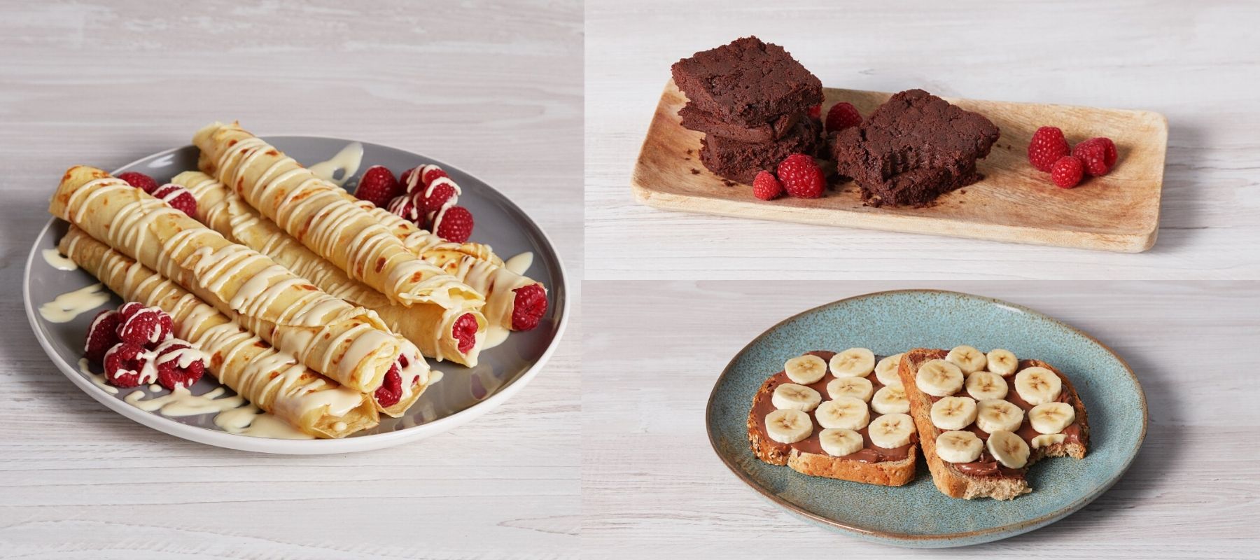 - Gib zu deinen Pancake-Röllchen ein paar Himbeeren und wenn du es gerne extravagant magst, kannst du noch ein wenig geschmolzenen Protein-Aufstrich in weißer Schokolade draufträufeln. Gib einfach ein paar Löffel für 10-20 Sekunden in die Mikrowelle.
