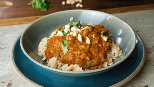 Serviere dein Chicken Tikka Masala mit Basmatireis, Fladenbrot-/Naanstreifen und gehackten Cashewnüssen.