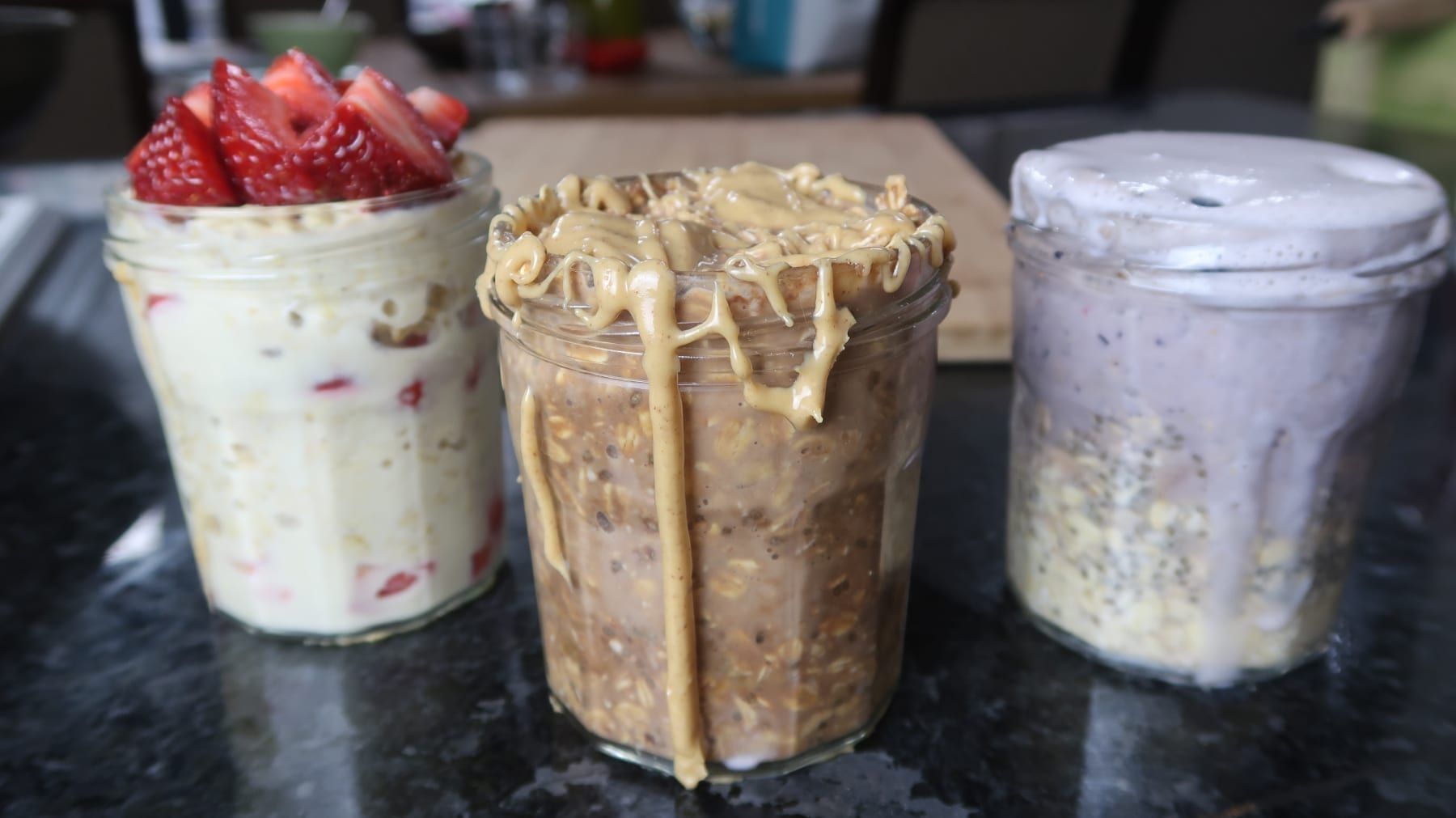 - Die Haferflocken, die Milch und die Chiasamen in einem Glas vermengen.