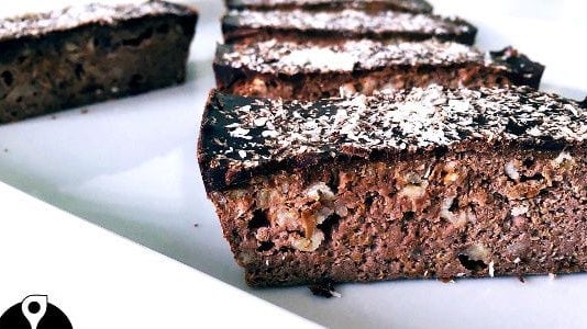 Eine Auflaufform (Diameter 20 cm) mit dem geschmolzenen Kokosöl auspinseln und Haferflocken-Kürbis-Masse darin verteilen. Brombeeren und Walnüsse auf die Masse legen.