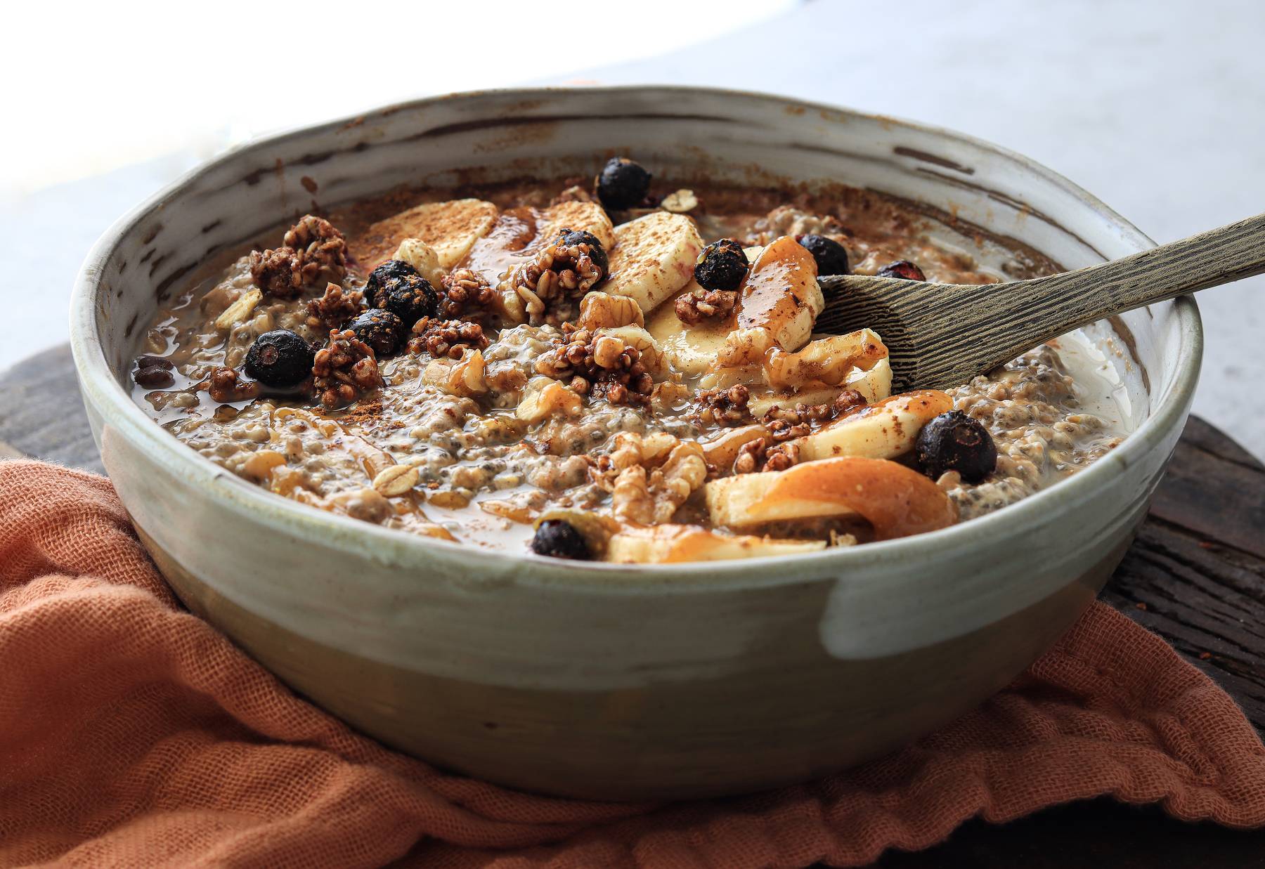 Toppe alles mit Walnüssen, Erdnussbutter und ein paar Bananenscheiben. Guten Appetit!