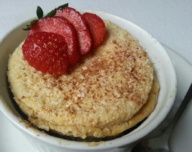 - Alle Zutaten mischen, in eine Tasse oder eine kleine Backform geben und für 2 Minuten auf voller Stufe in die Mikrowelle stellen.