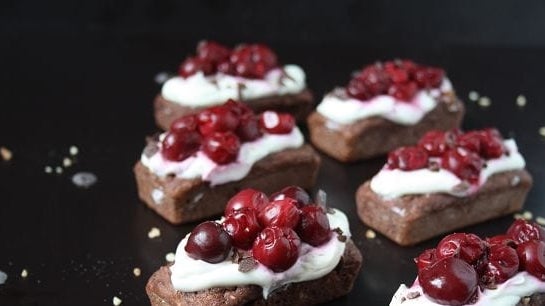 - Falte nun jeweils einen Pancake, so dass du ihn je unten und oben mit einer Quarksorte füllen und den restlichen Him- und Heidelbeeren drapieren kannst (wie auf dem Bild!)