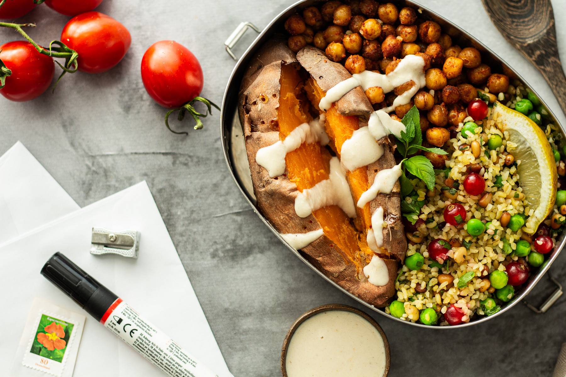 Es muss nicht immer Reis mit Hühnchen und Brokkoli sein, wenn es um ein ausgewogenes, reichhaltiges Mittagessen geht. Probiere es doch mal stattdessen mit gebackenen Süßkartoffeln und Kicherbsen, sowie einem herrlich erfrischendem Bulgur Salat.