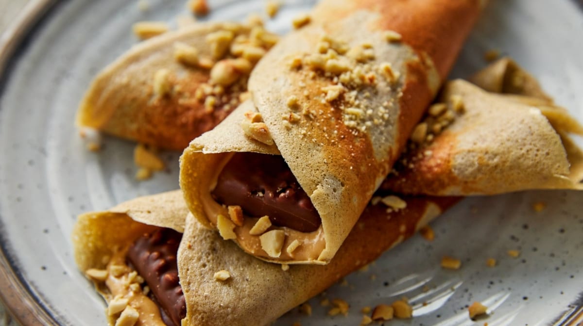 - Sobald du den Pfannkuchen von beiden Seiten gebraten hat, gibst du ihn auf einen mikrowellen geeigneten Teller. Streiche Erdnussbutter drauf und lege einen Carb Crusher Proteinriegel in die Mitte. Wickel den Carb Crusher Riegel mit dem Pfannkuchen ein.