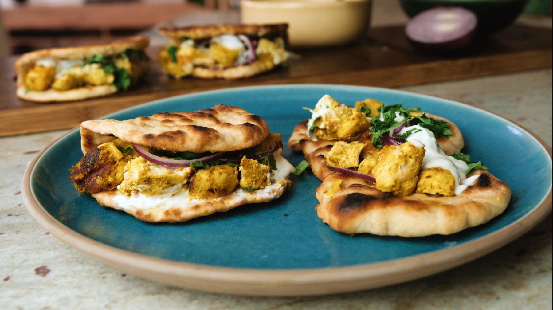 - Füge zum Servieren das Hähnchen-Tikka Naan hinzu. Belege es mit griechischem Joghurt, Koriander und roten Zwiebelscheiben und falten es dann zu einer köstlichen Hähnchen-Tikka-Naan-Rolle. Guten Appetit!