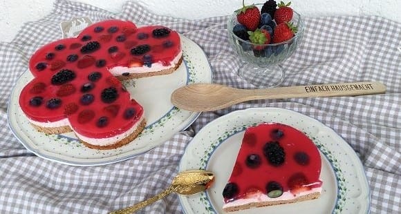 - Zum Schluss belegst du deinen Kuchen mit frischen Beeren deiner Wahl und bereitest den Tortenguss nach Packungsanweisung zu.