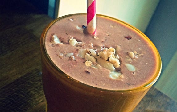 - Gib alle Zutaten, bis auf die Paranüsse, in den Shaker und mixe es für zirka 1 Minute gut durch.