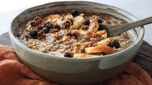 Vermenge die Haferflocken, 30g Clear Soy Protein in der Geschmacksrichtung Traube, Rosinen, Weintrauben, Sonnenblumenkerne, Kürbiskerne, Salz und das Vanille Extrakt miteinander.