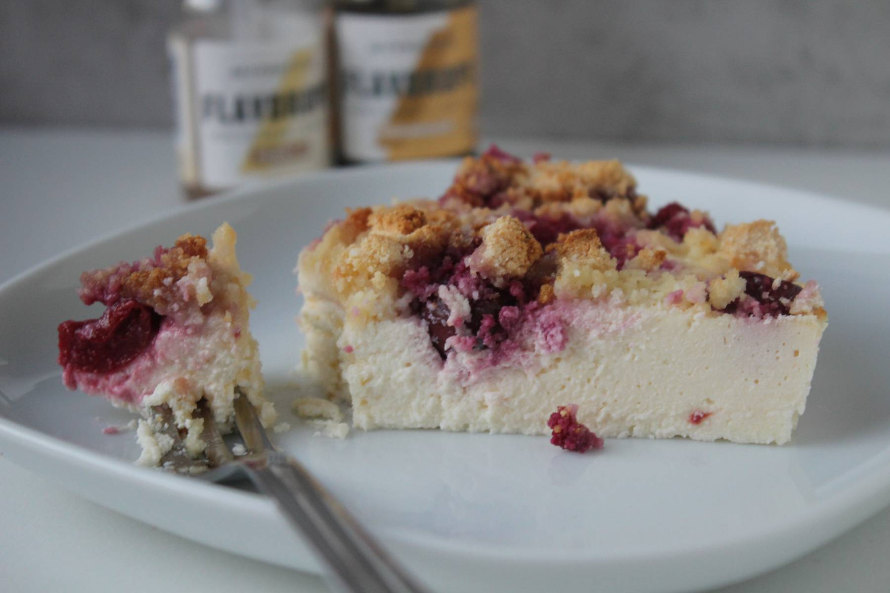 Cremiger Käsekuchen mit Kirschen & Streuseln | Ohne Butter & Zucker