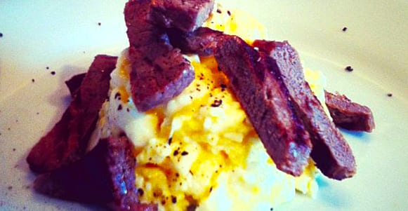 - Um den Proteingehalt zu erhöhen, kannst du wahlweise mehr Rindfleisch, mehr Eier oder einfach einen gepflegten Impact Whey Proteinshake dazu trinken. - - Zu den Eiern passen darüber hinaus noch ein paar Streifen Bacon.