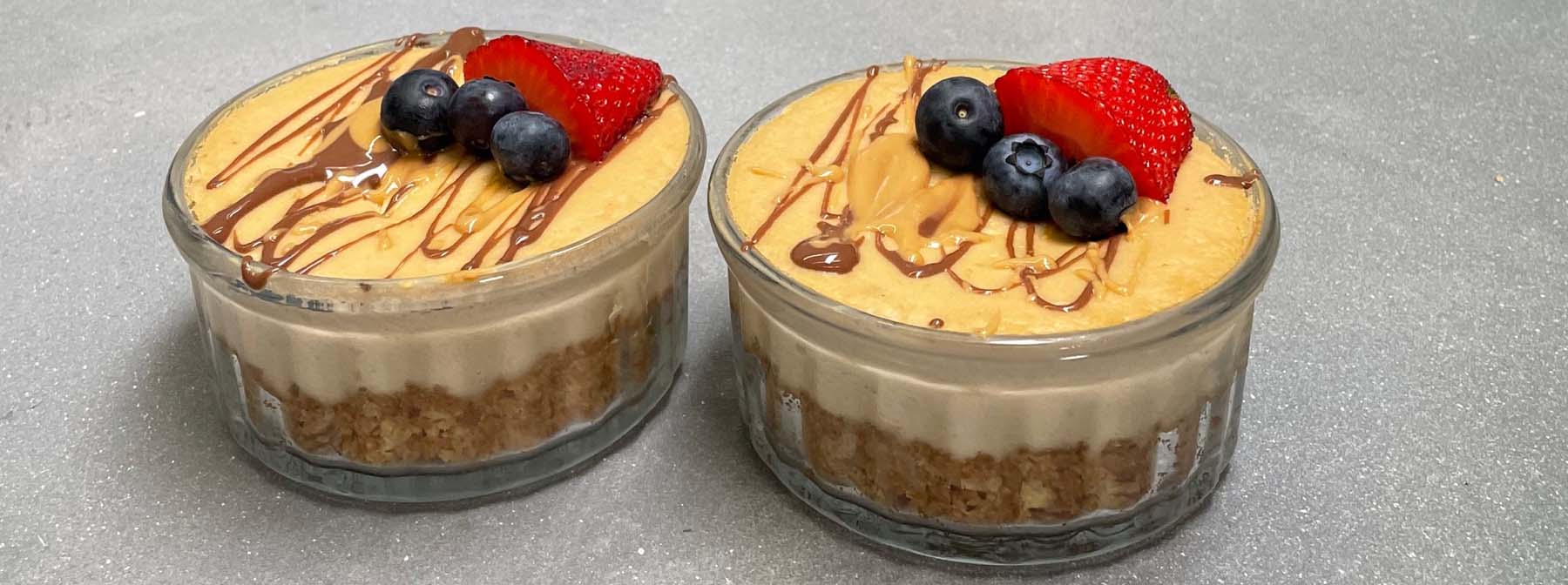 Nachdem der Käsekuchen vollständig auskühlen konnte, kannst du ihn mit deinen Lieblings-Toppings dekorieren. Wir haben uns für Erdnussbutter, Protein-Aufstrich und frisches Obst (Erd- und Heidelbeeren) entschieden. Lass es dir schmecken.
