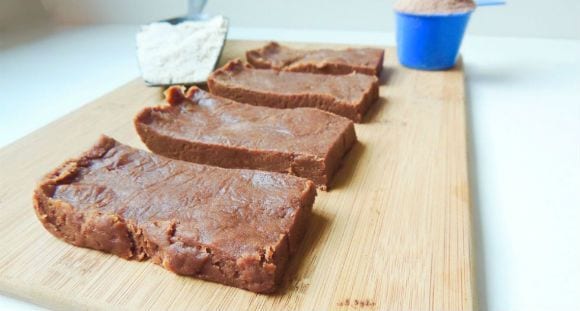- Stelle die Form nun für eine Stunde in die Gefriertruhe und schneide danach alles in 8 gleich große Erdnussbutter Riegel.