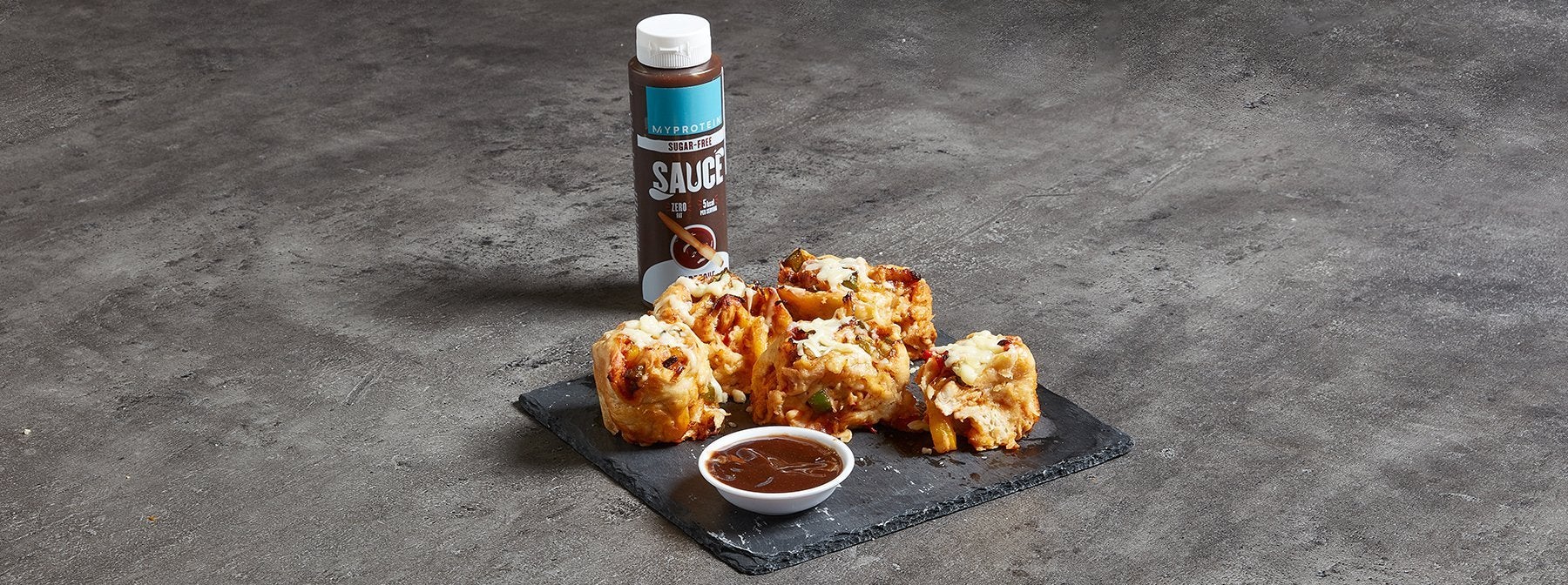 Lasse die Pizzabrötchen ein paar Minuten abkühlen, bevor du sie vorsichtig ausschneidest. Mit reichlich zuckerfreier BBQ Sauce servieren und genießen!