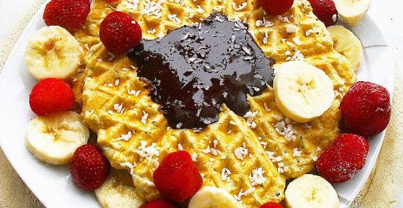 - Backe die Waffeln und serviere anschließend mit einem Topping deiner Wahl!