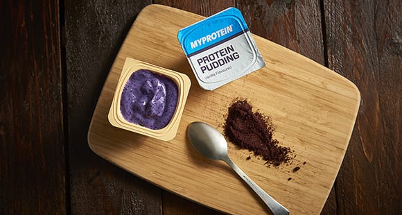 - Zuerst öffnest du einen Becher des Protein-Puddings und gibst einen Teelöffel unseres Nutri Purples Fruit Blends hinzu.