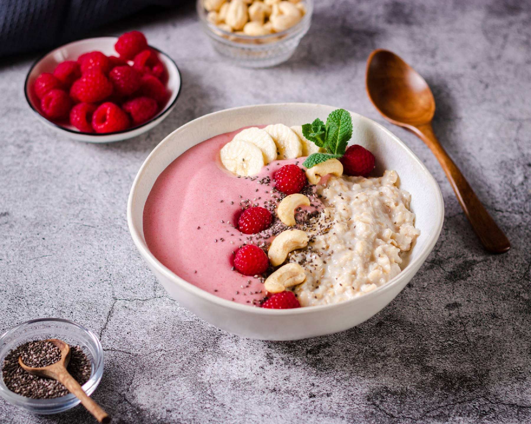 - Banane, Himbeeren, Chia Samen, Sonenblumenkerne zum Servieren