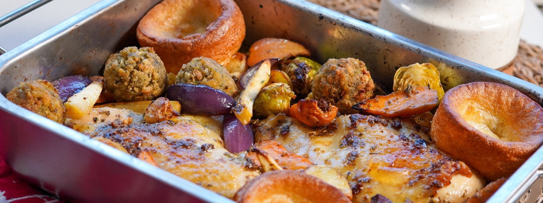 Hole nun die Auflaufform aus dem Ofen und gib den Yorkshire Pudding hinzu. Backe alles für weitere 5 Minuten.