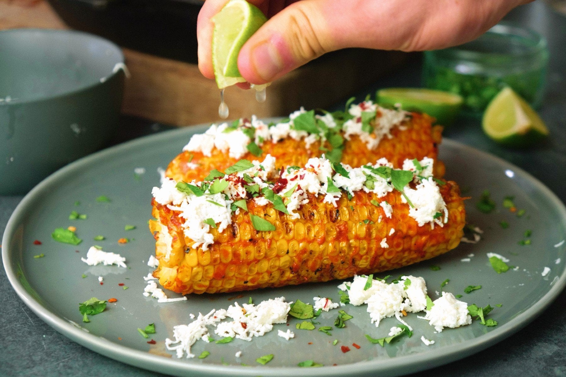 Den gegrillten Mais mit geriebenem Feta bestreuen, mit Chiliflocken und Koriander garnieren. Jetzt noch mit einem großzügigen Spritzer Limette abschließen und genießen.
