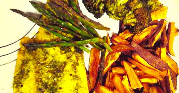 - Nach dem Backen (insgesamt 36-40 Minuten oder solange, bis das Essen die gewünschte Bräune und Garzustand hat), servierst du den Fisch, die Süßkartoffelchips, den Brokkoli und Spargel auf einen (oder mehrere) Teller. Würze nach Belieben.