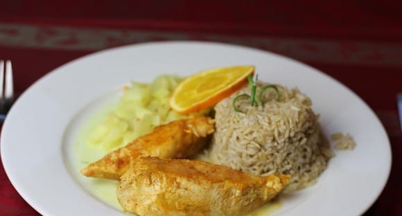 - Zum Schluss den Reis mit dem Hähnchenfilet, dem Fenchelgemüse und einer Orangenscheibe anrichten.