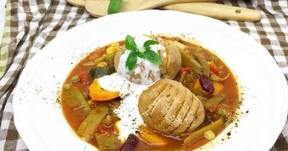 - Zu guter Letzt kannst du den Eintopf in einem Teller servieren und mit den fertigen Ofenkartoffeln ergänzen. Verfeinert mit Sojajoghurt ein wahrer Genuss!