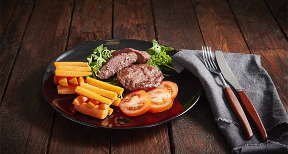- Serviere Hamburger + Karotten auf einem Teller zusammen mit dem Salat.