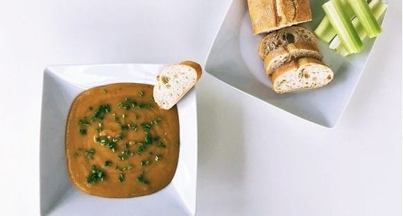 - Wenn die Zutaten weich sind, den Frischkäse zugeben und mit einem Pürierstab zu einer Suppe verarbeiten.