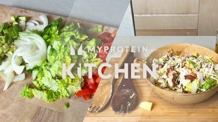 Bereite zuerst die Zutaten vor, indem du die vorgegarte Hähnchenbrust, die große Avocado, den Kopfsalat und die Tomaten in kleine Stücke schneidest. Die Zwiebel wird dagegen in Scheiben geschnitten. Gib alles in eine große Schüssel.