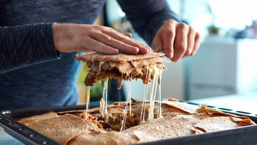 Die Füllung gegebenenfalls mit etwas geriebenem Käse bestreuen und Tortilla zuklappen.