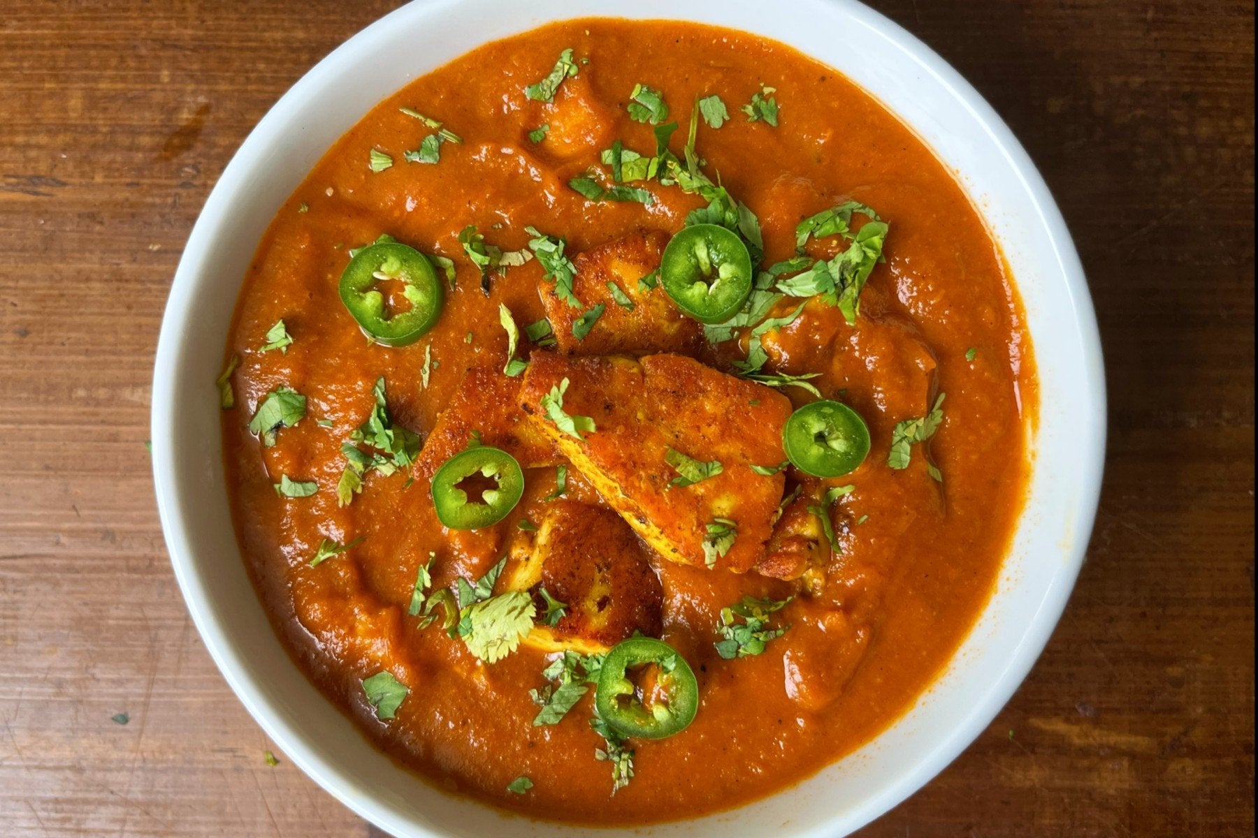 Die reichhaltige Currybasis ist seidenweich und passt perfekt zu den knusprigen, gewürzten Halloumi-Würfeln. Himmlisch.