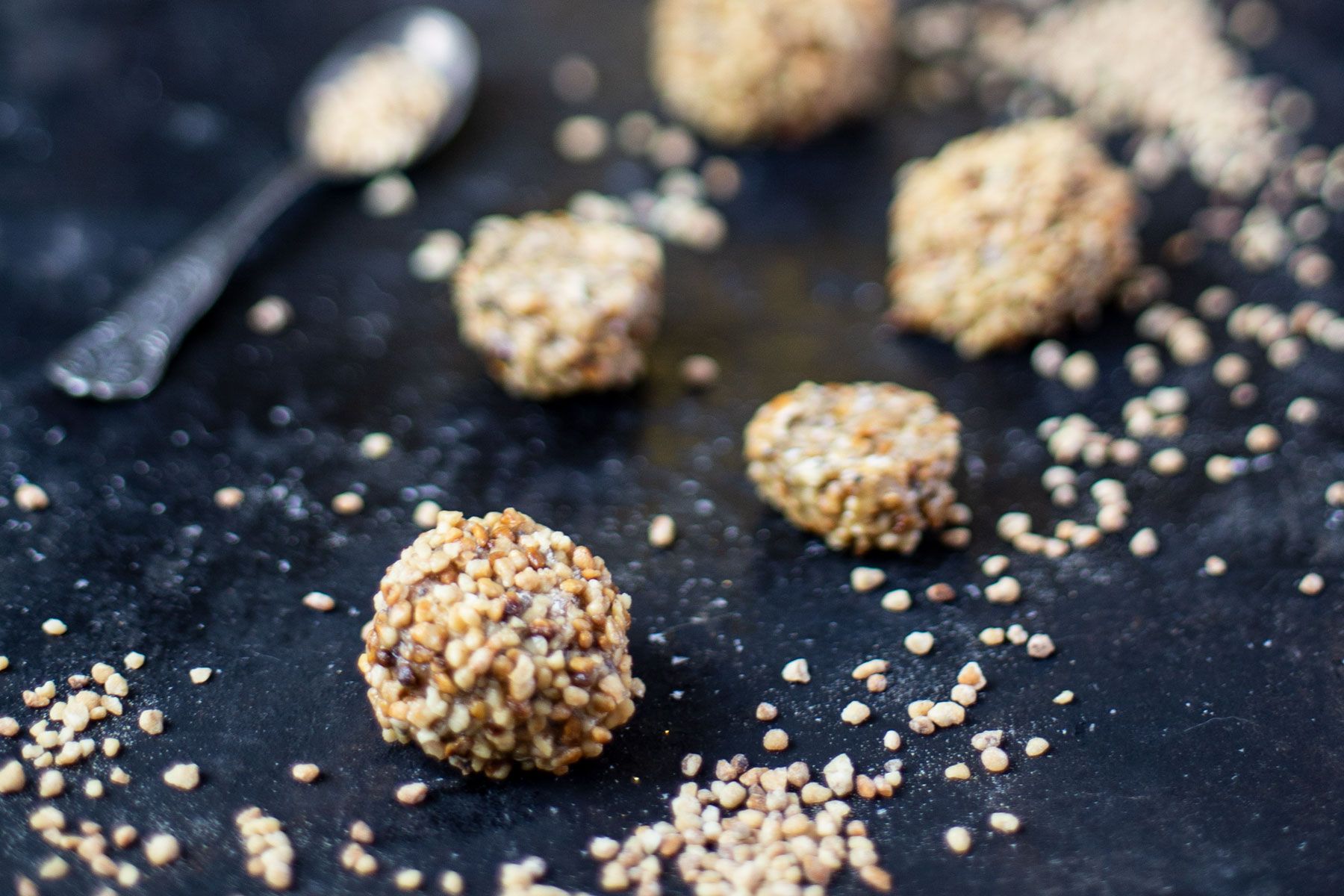 Dann rollt ihr aus diesem „Teig“ 10 kleine Kugeln und wälzt sie in den restlichen gehackten Haselnüsse.