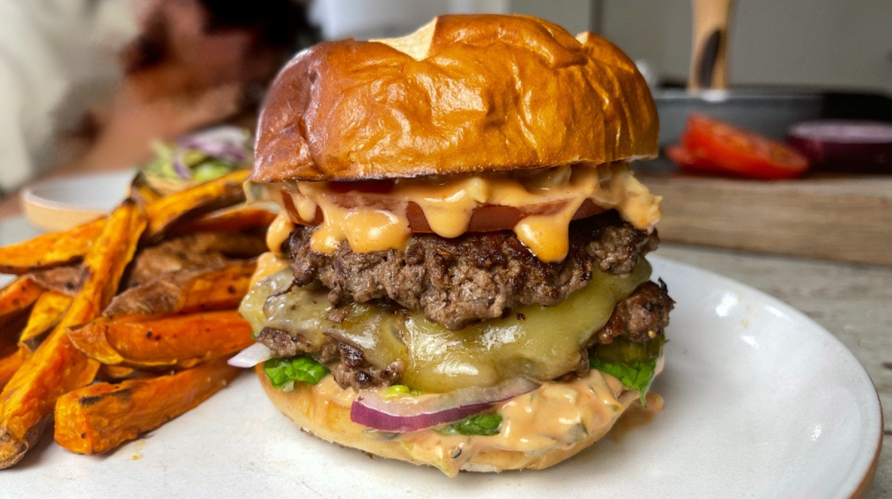 Mische zunächst die Zutaten für die Burgersauce, bis sie vollständig miteinander vermengt sind. Bereite dann den Salat, die roten Zwiebeln und die Tomatenscheiben vor.