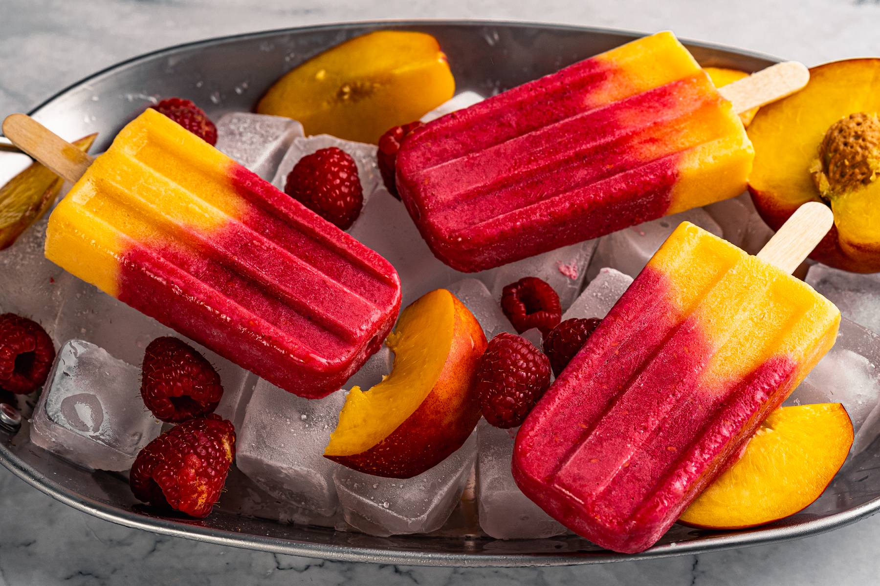 Die Pfirsiche halbieren, den Kern entfernen und schälen. Das Fruchtfleisch zusammen mit 60ml Milch und Protein in einem Mixer pürieren, in die Formen füllen und die Holzstiele reinstecken.