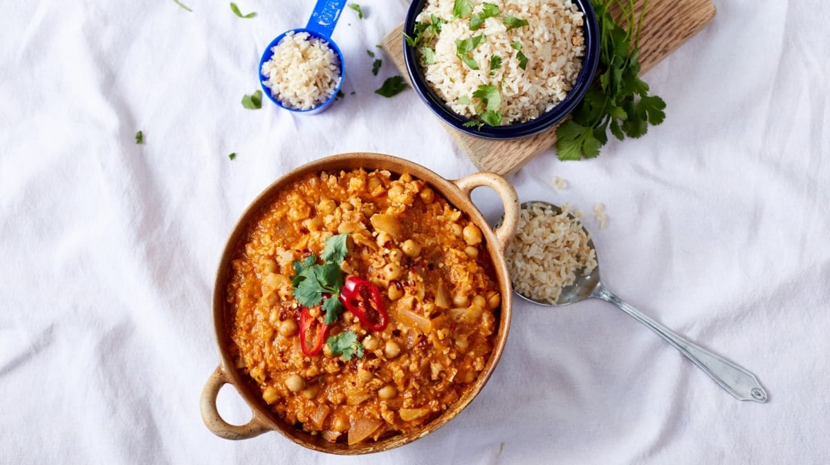 Iss dein Curry mit Vollkornreis, etwas Joghurt und ein paar Tropfen Limettensaft.