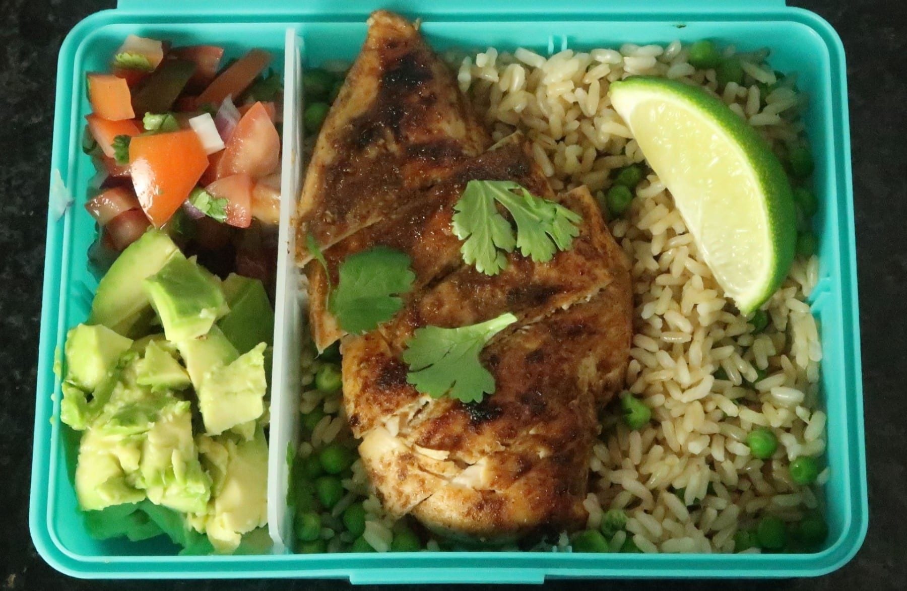- Bereite nun dein Mittagessen in der Tupperdose zu. Füge noch ein wenig Reis mit Erbsen hinein. Am Ende kommt das Jerk Chicken, die Salsa und schlussendlich die Avocado in die Box.