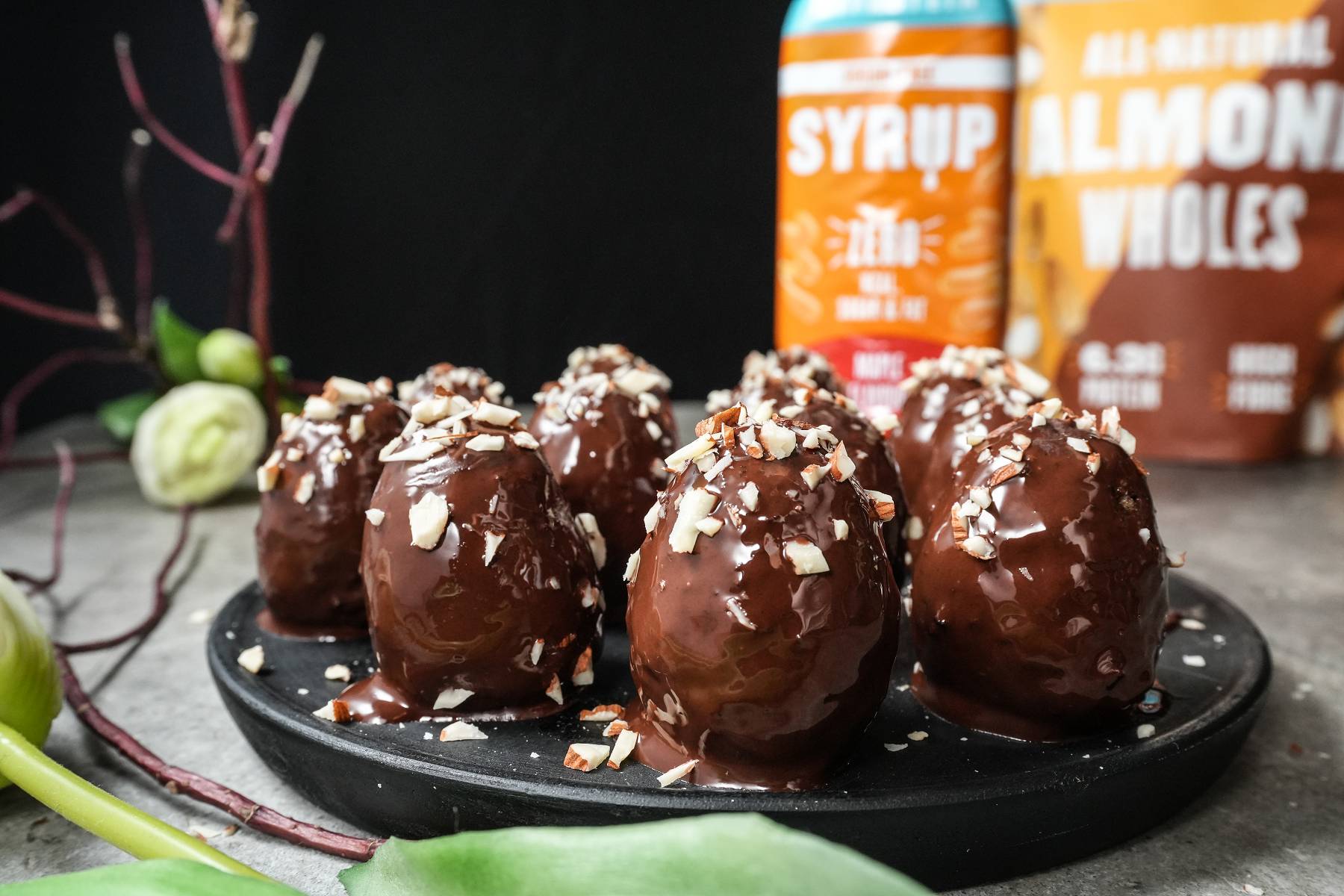 Die Pralinen darin wenden. Abschließend mit den Mandeln dekorieren und in einem Kühlschrank erkalten lassen