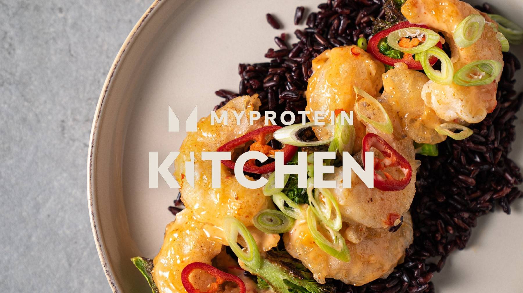 Knusprige Sriracha-Garnelen mit schwarzem Reis