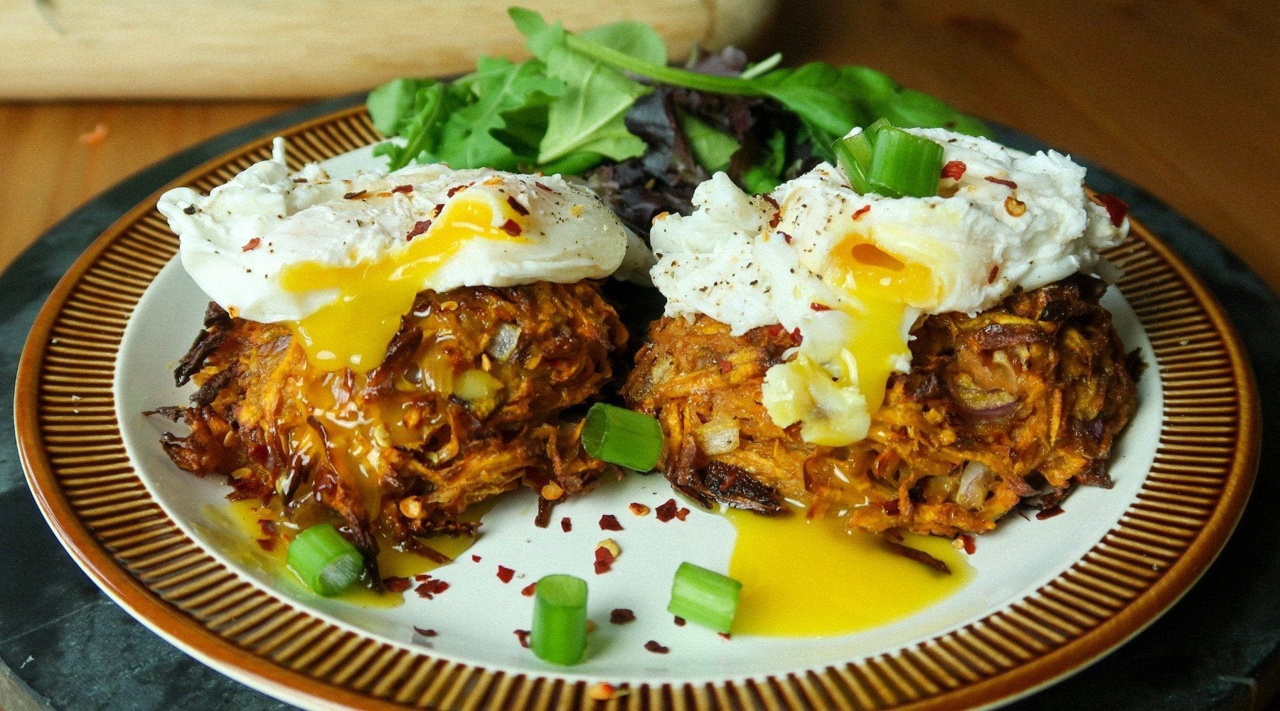 Knusprig von außen, herrlich weich in der Mitte und super-sättigend, passen diese Röstis perfekt zu pochierten Eiern - eine ideale Kombination, die für ein gesundes, proteinreiches Frühstück sorgt.