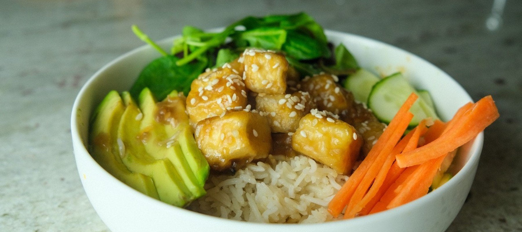 Gib den Tofu mit Teriyaki-Sauce, zusammen mit einer Portion Reis und Salat, in deine Klick Box. Vergiss nicht die Karotten, Gurken und die Deko mit Sesamsamen!