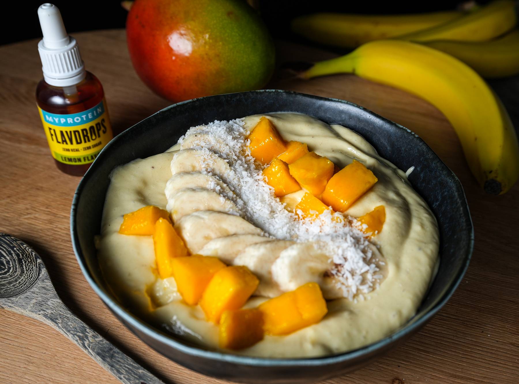 Fülle die Smoothie Creme in einen tiefen Teller und toppe sie mit ein paar Mangostückchen, Bananenscheiben und Kokosflocken.