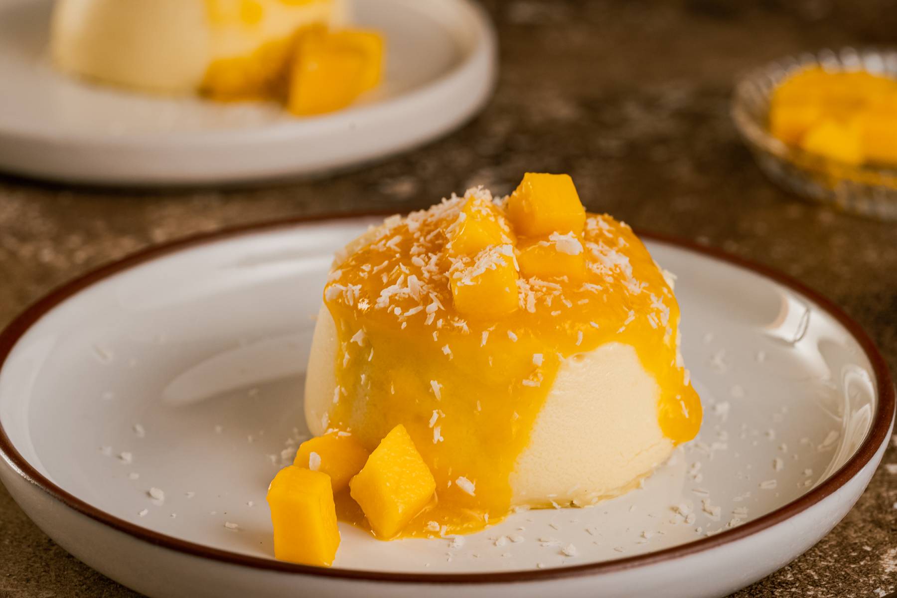 Danach wird der Pudding auf einen Teller gestürzt. Würfel die Mangos klein und verteile ein paar Stückchen auf dem Pudding.