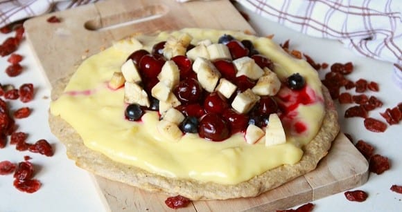 Ihr könnt natürlich auch noch mehr Haferflocken durch Proteinpulver ersetzen, allerdings schmeckt es mir persönlich dann nicht mehr so gut, aber das ist ja Geschmackssache ? beim Belag könnt ihr auch kreativ sein! Nehmt unterschiedlichen Pudding oder Joghurt und anderes Obst, so habt ihr jedes Mal eine neue Pizza