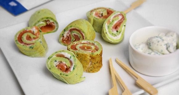 - Wenn die Pfannkuchen etwas ausgekühlt sind, kann man sich ans Füllen machen. Dafür immer etwas vom Kräuterquark auf einem Pfannkuchen verteilen, sodass diese vollständig damit bedeckt sind. Dann den Räucherlachs darauf verteilen und alles eng aufrollen. Darauf achten, dass auch am Rand Quark ist, damit die Rollen auch zusammen kleben.