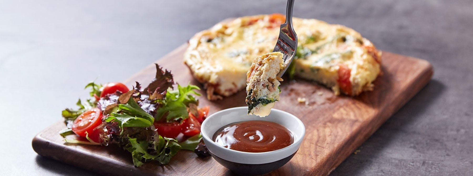 Hole das Omelette aus dem Backofen und serviere es mit reichlich zuckerfreier Sauce (BBQ). Köstlich!