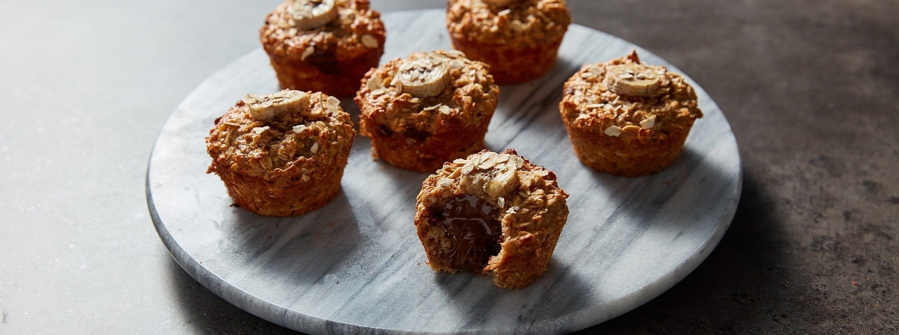 Gib jetzt eine Bananenscheibe auf die Oberseite jedes Muffins, bestreue diese mit ein paar Haferflocken und backe sie dann 20 Minuten lang im Ofen.