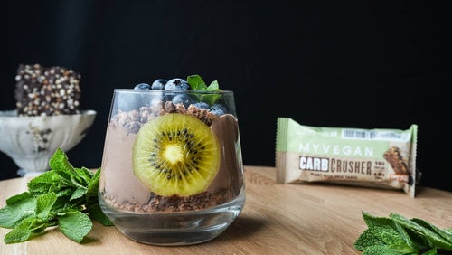 Den Protein Cookie fein würfeln und die Hälfte in eine Schüssel geben.