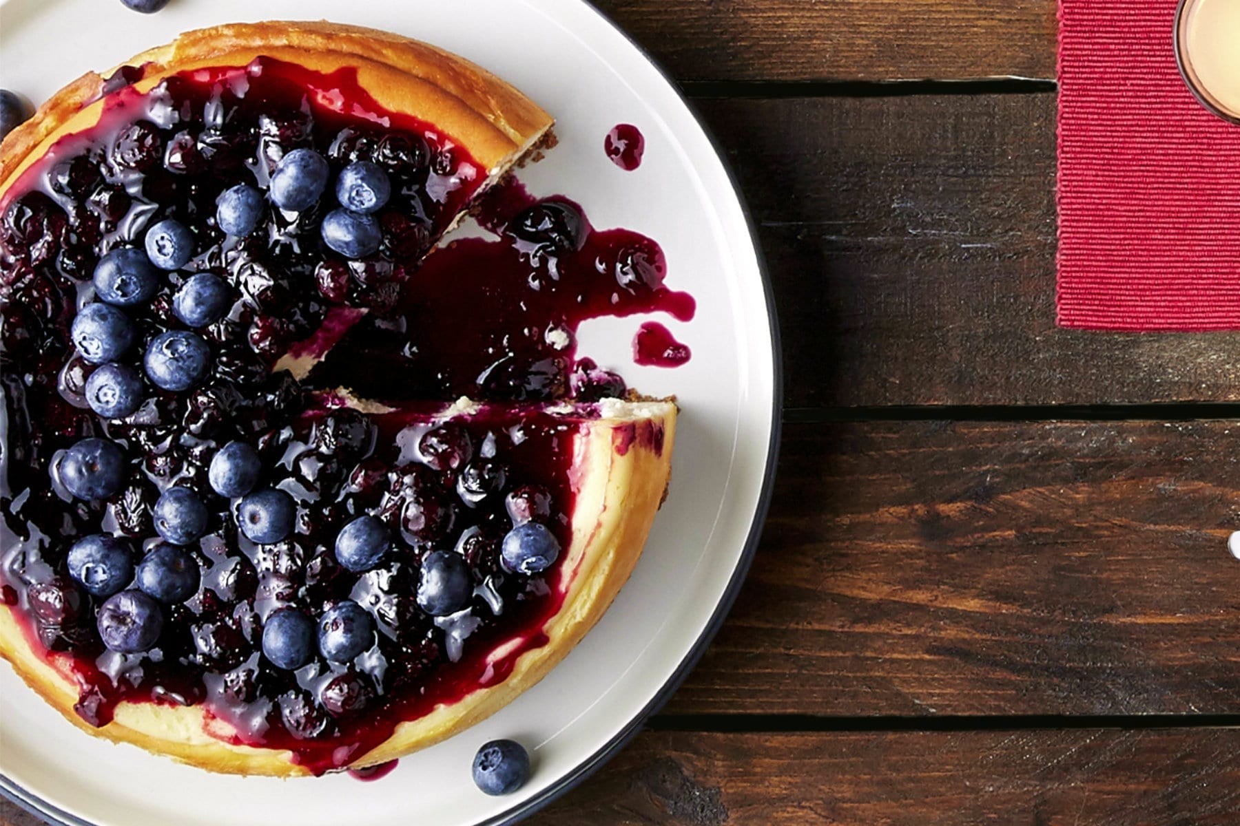Während der Käsekuchen abkühlt, die (optionale) Blaubeercoulis zubereiten. Eine große beschichtete Pfanne auf mittlerer Stufe erhitzen und die Blaubeeren hineingeben. 3-4 Minuten braten, dann das Wasser und den Zucker hinzufügen. Weitere 8-10 Minuten braten, damit die Mischung einkochen kann, dabei gelegentlich umrühren. Sobald eine dicke, sirupartige Konsistenz erreicht ist, vom Herd nehmen und zum Abkühlen in eine Schüssel gießen.